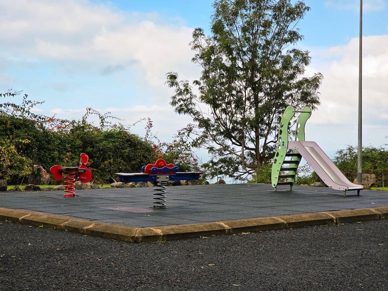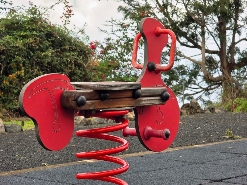 Parque infantil equipado con un tobogán y un balancín con diseño de nubes que invita al juego en equipo y un muelle en forma de moto. Este espacio está diseñado en un entorno seguro para niños y niñas.